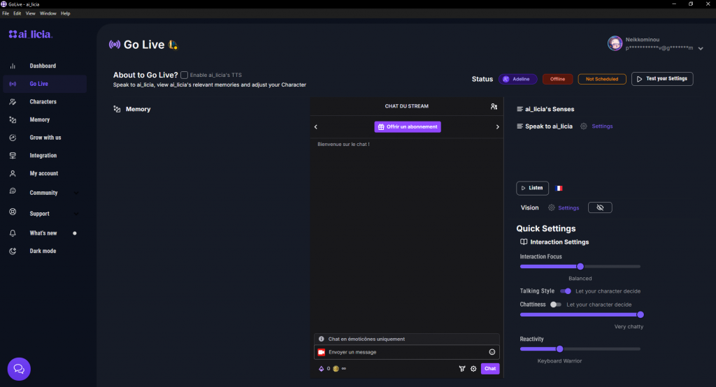 Chaque streamer est unique. Ai_licia le sait. Via son tableau de bord, vous la façonnez. Choisissez son ton : amical, sarcastique, ou sérieux. Ajustez ses réponses à votre communauté. Vous streammez du gaming compétitif ? Elle adopte un style énergique. Plutôt du chill ? Elle devient douce et posée. Cette flexibilité séduit. Elle reflète votre personnalité. Ainsi, vos viewers la perçoivent comme une extension de vous.