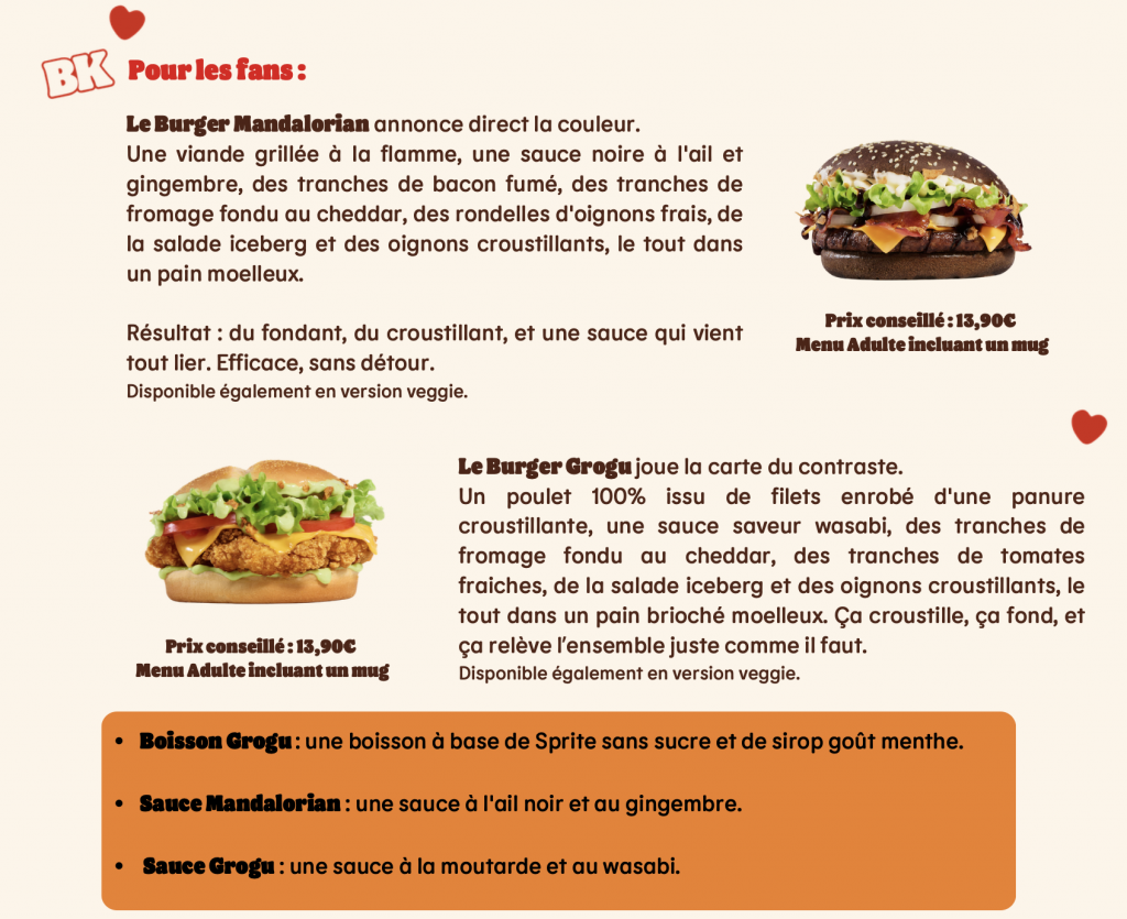 manière ludique et savoureuse de célébrer la sortie de Star Wars : The Mandalorian and Grogu.Déclaration de Sabrina Ferretti, Vice President, Burger King International.