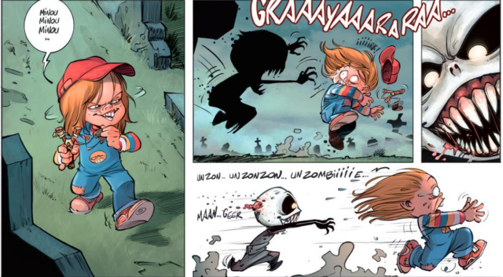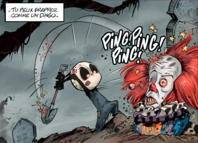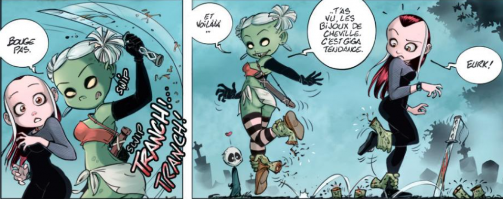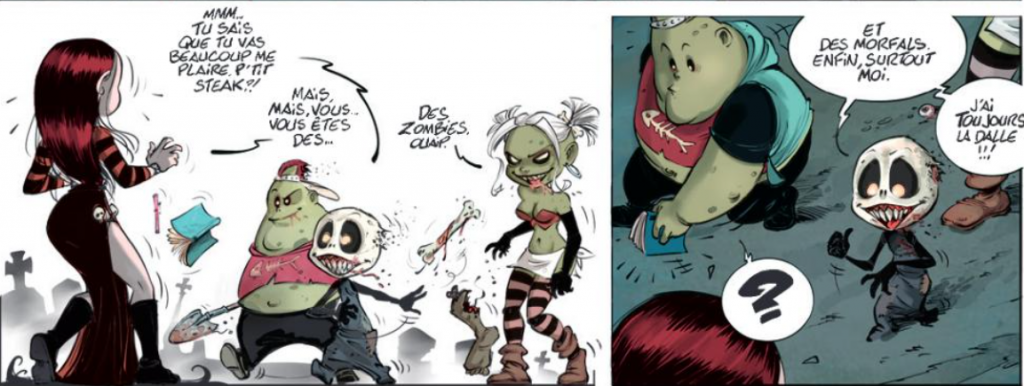 Rapidement, on prend plaisir à retrouver ce trait si plaisant de William qui fait mouche avec le scénario de Christophe Cazenove. L’humour est toujours aussi décapant, les catastrophes s’enchaînent tout comme les références à la Pop culture comme le pauvre pennywise qui même dans la tombe ne peut pas reposer en paix, Chucky en sale garnement qui aime martyriser les matous du coin… J’ai trouvé amusant de découvrir la vie du cimetière en compagnie de Margotix, Tizombi, Tékaté, FatAl et toute la bande. Une petite fresque gothique teintée d’humour noir qui nous fera penser à Beetlejuice et autres œuvres de l’âge d’or de Tim Burton.