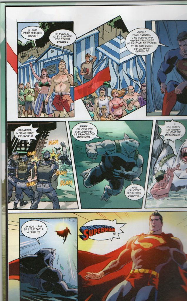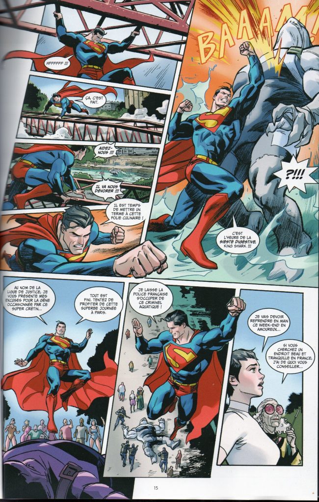 Pour cette anthologie, pas moins de quinze aventures nous attendent. Porte étendard de la paix à l’internationale, l’homme d’acier débute ses vacances à Paris qui sont rapidement perturbées par ce cher King Shark (un clin d’oeil à Sous la Seine?). S’ensuivent alors des récits nous emmenant aux quatre coins du globe.