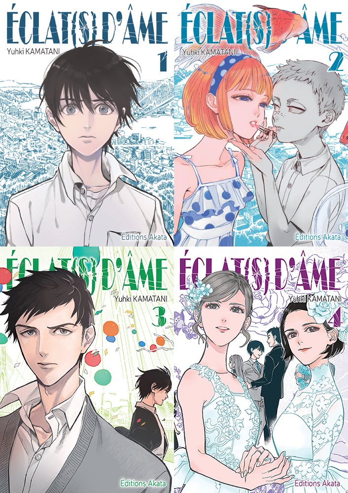 L’édition française d’Éclat(s) d’âme est publiée par les éditions Akata, dans leur collection Large. L’éditeur connu pour son catalogue sensible aux thématiques LGBT+ (il avait déjà sorti Le Mari de mon frère), a lancé la série en France à partir du 22 février 2018. La traduction est signée Aurélien Estager. La série compte exactement 4 tomes au total, et elle est terminée en français comme en japonais (le dernier tome est sorti en décembre 2018). Le format est (d’environ 176 pages par volume, prix autour de 8,05 € ). Akata avait même fait un geste solidaire pour le tome 2 en reversant 5 % des ventes à l’association SOS homophobie pendant plusieurs mois.