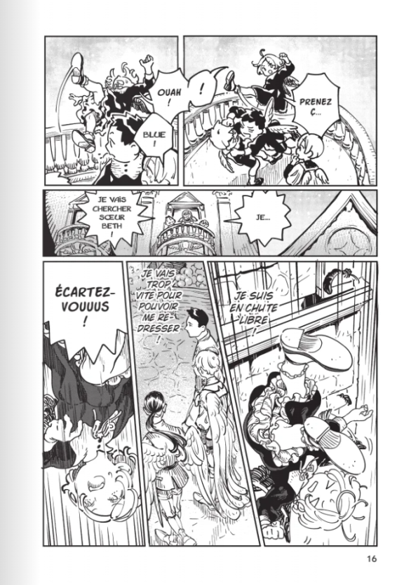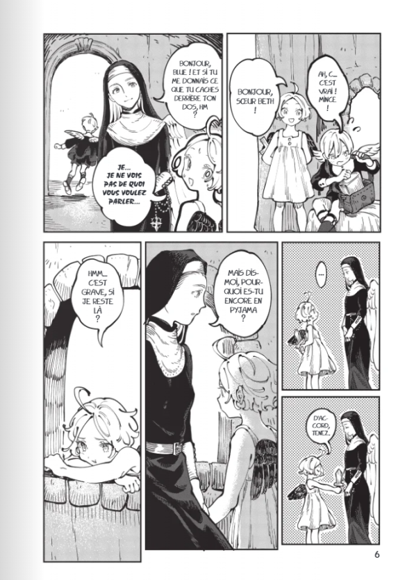 Ce manga propose de belles images. Dès les premières pages, le style de BOMHAT rappelle la finesse et l’élégance de Kamome Shirahama qui est également à l’origine de L’Atelier des Sorciers, met au service d’un récit beaucoup plus sombre et torturé. Le contraste entre la blancheur des Anges et l’encre noire sur les pages ressort surtout lors des scènes de combat.