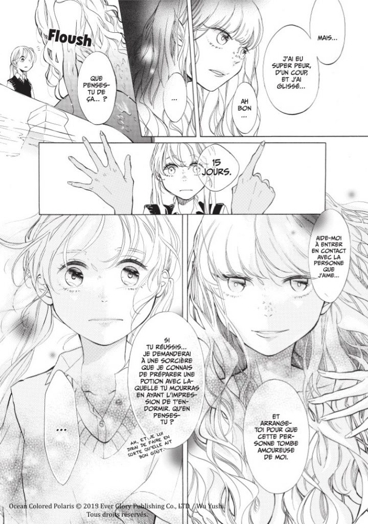 J’ai lu très peu de mangas de ce style, mais franchement, je ne suis pas déçu. Il y a beaucoup de choses auxquelles on ne s’attend pas. Tout d’abord, le fait qu’une relation entre une humaine et une sirène puisse se créer est quelque chose d’original. Au départ, on se demande où l’histoire veut en venir, mais au fil du temps, on voit les choses évoluer. Même si c’est parfois un peu décousu et qu’on ne comprend pas toujours tout, malgré les petits textes beaucoup trop présents qui m’ont un peu empêché d’apprécier pleinement l’œuvre à sa juste valeur. J’ai quand même beaucoup apprécié. L’histoire reste touchante, et on se demande toujours si tout va aller mieux pour Zi Xuan.