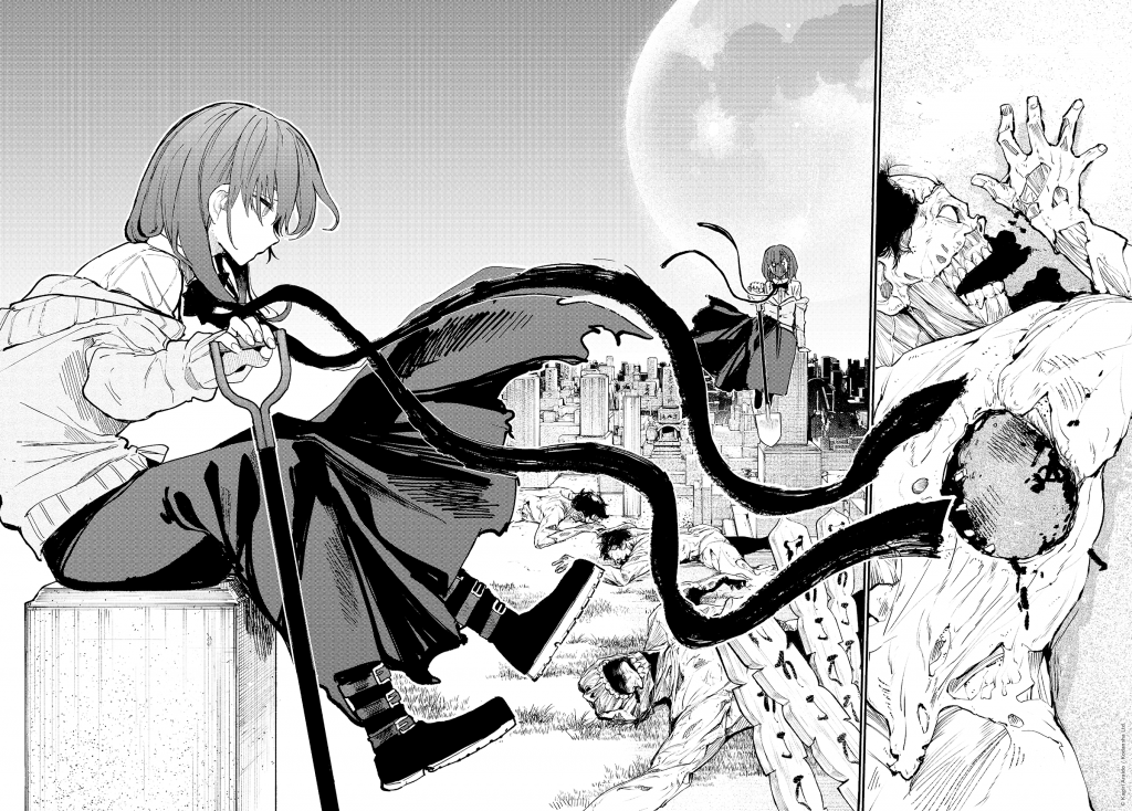 Tout débute au cimetière Okanami où un humain a été vidé de toute son énergie vitale. L’occasion de découvrir Rota et Hiromu, deux fossoyeurs chargés de renvoyer ces entités dans la tombe. Un duo pour le moins atypique, ne serait-ce que par l’écart d’âge entre les deux chasseurs. Mais aussi leur manière de se tacler mutuellement en permanence.