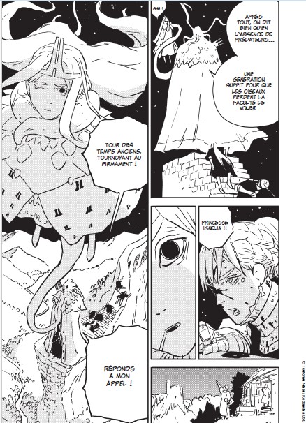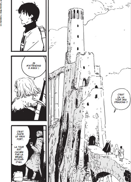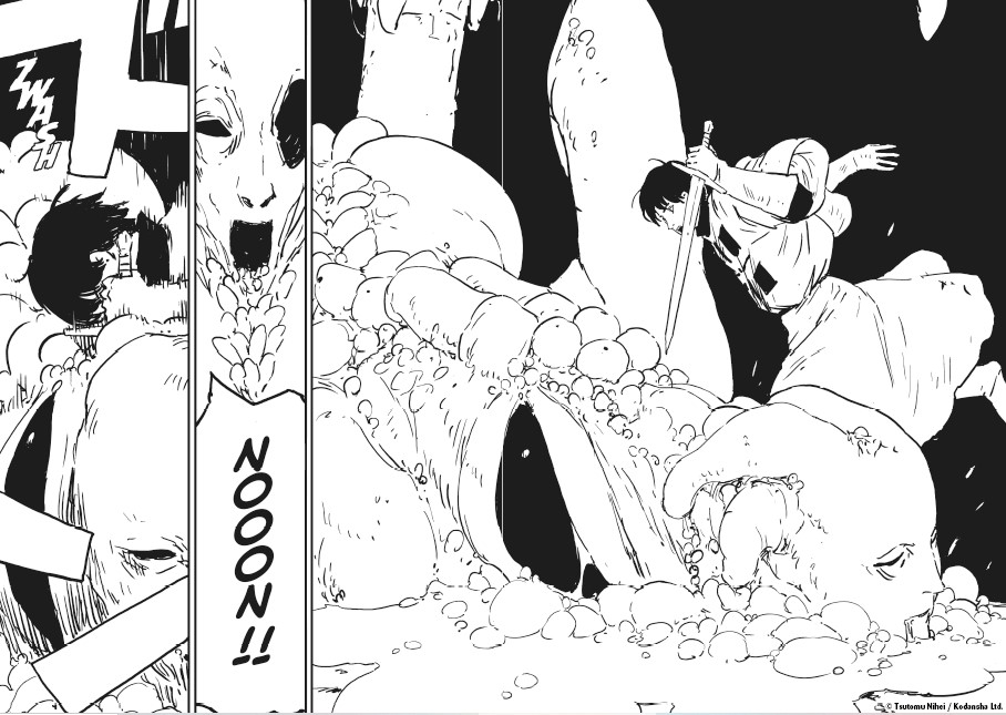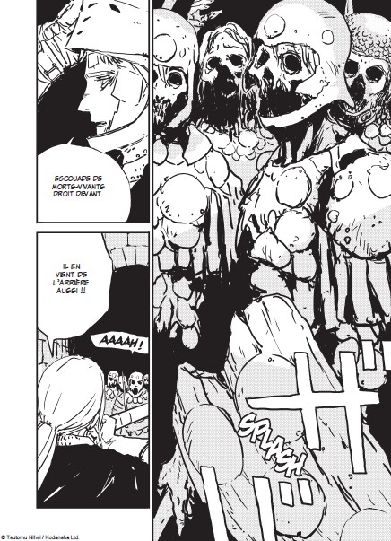 Dès les premières pages, Tsutomu Nihei parvient à nous captiver en nous proposant un récit qui nous ramène en terrain connu. Une fois la présentation de Yuva et des membres de la garde royale, nous découvrons la tour qui est un immense donjon divisé en niveaux. La présence de nombreux objets de quête. Mais surtout du bestiaire nous ramène aux calciques du moment comme Solo Leveling et l’excellent Gloutons et Dragons.