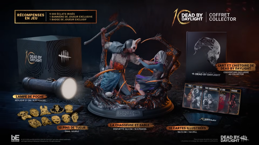 De plus, le Coffret collector comprend une réplique fonctionnelle grandeur nature d’une lampe de poche, 10 pins de tueurs, 10 cartes illustrées et une édition exclusive au Coffret collector de L’art et l’histoire de Dead by Daylight. Il inclut également des récompenses en jeu échangeables, dont une bannière et un badge exclusifs pour le joueur, ainsi que 9 000 éclats irisés. Les précommandes sont ouvertes jusqu’au 31 janvier 2026. Disponible dans la limite des stocks disponibles.