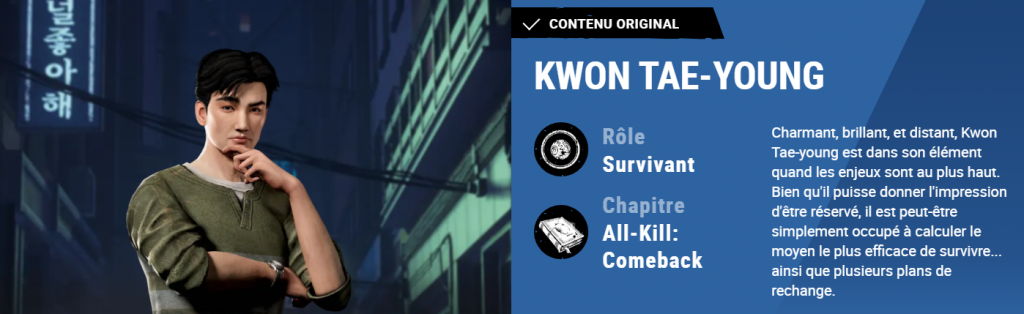 Le nouveau venu dans la liste des survivants de Dead by Daylight s’appelle Kwon Tae-young. Charmant, brillant et discrètement distant, Tae-young a une histoire qui se déroule dans les coulisses de l’industrie de la K-pop. Il a été embauché en tant que concepteur technique par Mightee One Entertainment pour diriger la création de MiNA, une idole virtuelle à l’image du Farceur lui-même. Tae-young est doublé dans le jeu par Kevin Woo, idole de la K-pop et vétéran de l’industrie, qui reprend aussi son rôle de consultant sur All-Kill en 2021, et ce, afin d’ajouter de l’authenticité et de la profondeur à la nouvelle sortie du jeu.