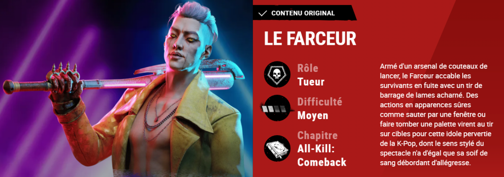 Afin de ne pas se faire détrôner, All-Kill: Comeback comporte aussi une mise à jour centrée sur le gameplay du Farceur pour raffiner son style de jeu et accroître son impact afin qu’il demeure un choix compétitif dans le paysage en constante évolution de Dead by Daylight. Le nouveau système de Classes de Style est au cœur de la mise à jour, et il est conçu pour inciter les joueurs à revoir leur approche du personnage en récompensant la créativité, l’agressivité et la vitesse à mesure que le Farceur progresse pour déchaîner son Événement principal et une rafale de lames.