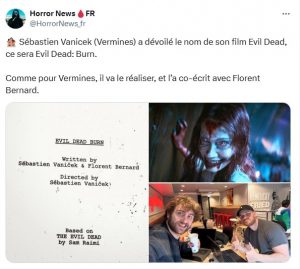 Après un Evil Dead Rise sympathique mais qui avait divisé lors de sa sortie l’an dernier, nombreux sont les fans qui attendent le prochain opus de la franchise. La rumeur s’était vite confirmée en début d’année quand au prochain réalisateur. Qui n’est autre que Sébastien Vanicek  à qui l’ont doit l’excellent Vermines sorti en début d’année.