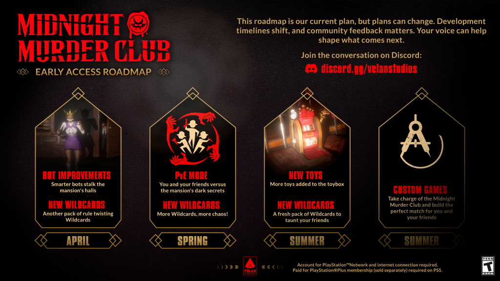 Jeux de cartes : Ajoutez des rebondissements imprévisibles et des effets transgressifs à chaque partie, pour tenir tout le monde en haleine et rendre chaque manche unique. Le chaos est au rendez-vous ! En parallèle du jeu, une édition « Guest Pass » est disponible gratuitement. En la téléchargeant, vous pouvez rejoindre la partie d’un ami possédant l’accès anticipé de Midnight Murder Club pour jouer au jeu avec lui. Jusqu’à 5 éditions Guest Pass peuvent rejoindre une partie hébergée par un détenteur du jeu. Vous pouvez également retrouver la roadmap