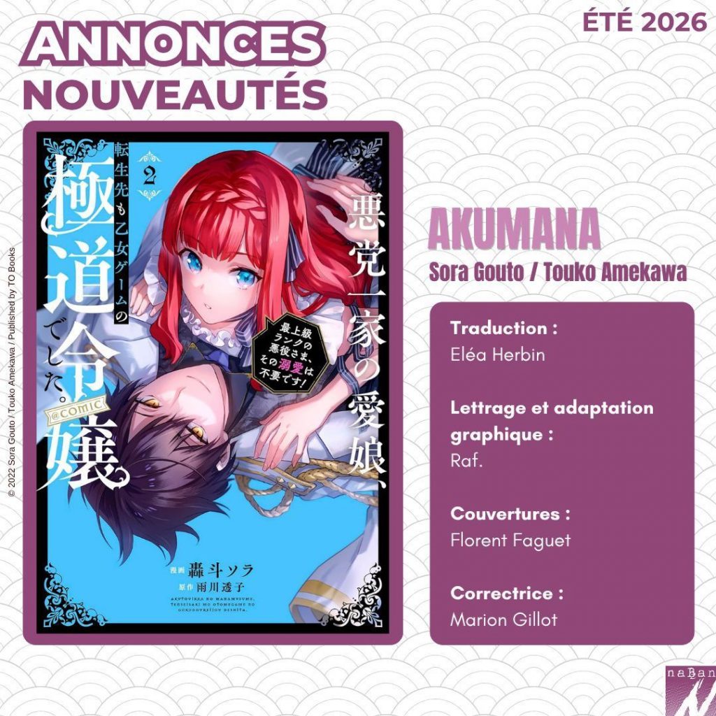 Après « 7th Time Loop », vous allez pouvoir découvrir en français un autre chef-d’œuvre signé Touko Amekawa. Akumana est un manga de comédie romantique dans un univers de mafia , où l’héroïne, réincarnée dans un otome game en tant que fille d’une famille yakuza, navigue entre romance et situations hilarantes avec un vilain surprotecteur prévu pour l’été prochain et une adaptation en animé est prévue prochainement !