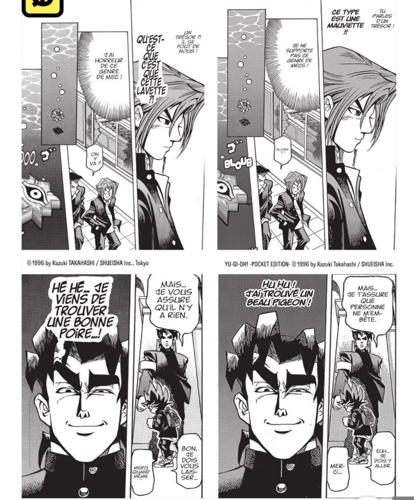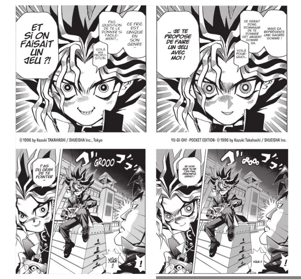 Yu-Gi-Oh! a démarré sa publication chez Kana en 1999 ! L’équipe éditoriale s’est donc posée la question de la traduction. La série étant assez complexe, il leur a semblé impératif de repartir de zéro, tout en mettant en place une « Bible » de référence, celle-ci étant garante d’hune harmonie à travers l’ensemble du manga. Un nouveau lettrage, plus moderne et surtout plus propre que celui de l’époque (il faut dire qu’en plus de 25 ans, les outils ont évidemment évolué) viendra également donner un petit coup de polish à la série. Ci dessous une comparaison de la première édition (à gauche), et l’édition millénium (à droite)