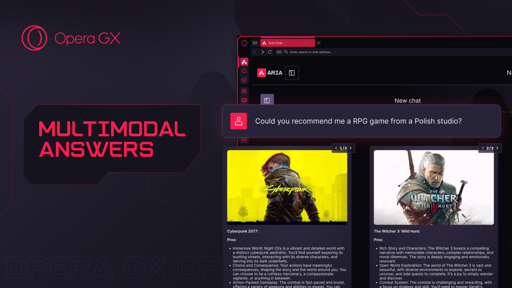 Par exemple, si un utilisateur cherche les derniers jeux d’un genre précis ou le meilleur casque gaming pour entendre le moindre bruit dans un jeu, Aria proposera des recommandations adaptées, avec des dates de sortie, les avantages et inconvénients, une description détaillée et des liens pour en savoir plus ou acheter le produit.