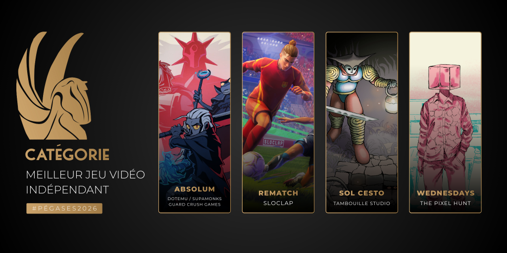 LAcadémie des Arts et Techniques du Jeu Vidéo est heureuse d’annoncer la liste des jeux composant les 18 catégories de la Cérémonie des Pégases 2026. Cette année, la cérémonie se tiendra le jeudi 5 mars 2026 à 20h00 à la Cigale (Paris)