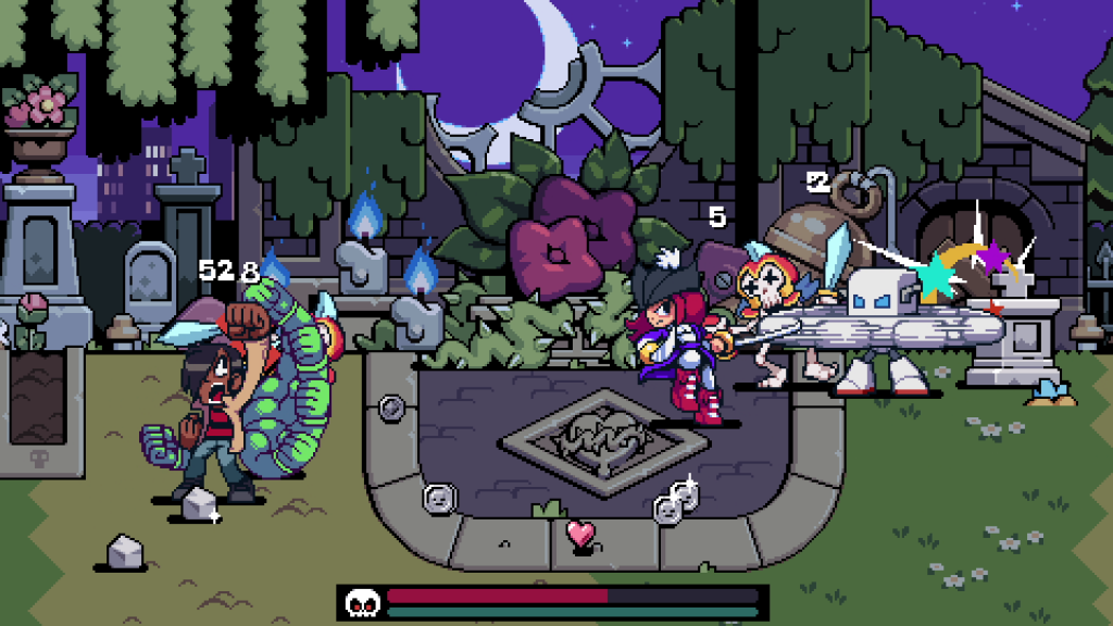 Battez-vous à travers ce Toronto sauvage aux couleurs éclatantes, largement inspiré des jeux vidéo de la licence et constellé de références appuyées à l’univers, pour accomplir des quêtes et dominer les gangs qui règnent sur les différents quartiers de la cité. Les ennemis peuvent être éliminés à l’aide des capacités uniques et évolutives de chaque personnage, ou grâce aux nombreux objets différents trouvés au hasard des environnements hautement interactifs du jeu. On parle notamment d’une batte de baseball, d’un bâton démoniaque, de navets et bien d’autres surprises. Avec sa toute nouvelle histoire co-écrite par Bryan Lee O’Malley et l’équipe de Tribute Games, en plus de pistes musicales exclusives signées par le spécialiste de la licence Anamanaguchi, Scott Pilgrim EX offre à la série un nouveau chapitre plein de panache, taillé pour les fans de la première heure comme pour les néophytes.