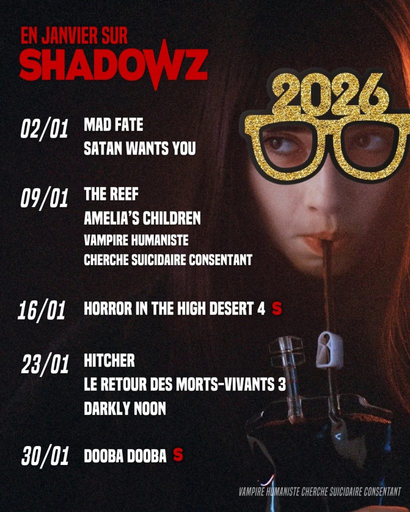 Amelia's Children, Darkly noon, Dooba Dooba, Hitcher, Horreur, Horror in the high desert 4, Le retour des morts-vivants 3, Mad Fate, News, Satan Wants You, Screaming, Shadowz, Shadowz janvier 2026, Streaming, SVOD, The Reef, Trailer, Vampire humaniste cherche suicidaire consentant
