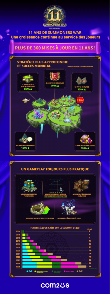 Cette année, Com2uS a renforcé ses échanges avec la communauté via un nouveau format appelé « Aperçu des développeurs », tout en multipliant les rencontres par le biais de compétitions esport et de tournées événementielles. Pour les 11 ans de Summoners War, un grand nombre d’événements sont actuellement organisés en jeu. Collectez des « Emblèmes des 11 ans » pour obtenir des tas de récompenses quotidiennes, ou récupérer des objets de votre choix via les pages d’événement.