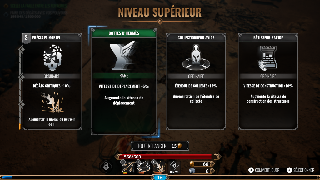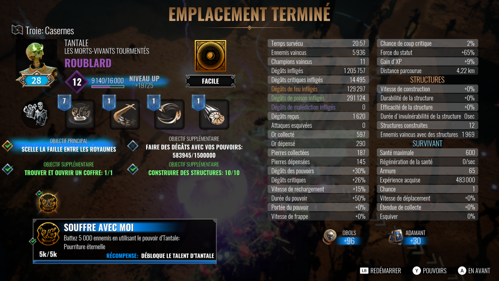De base vous aurez le choix entre la difficulté facile ou normale, le mode difficile se débloquant après avoir fini le niveau en normal. Plus de difficulté apporte plus d’expérience pour la classe de votre personnage, augmentant ainsi son efficacité au fil des parties. Pour débloquer des personnages ou réussir certains objectifs, n’hésitez pas à mettre en facile, surtout quand il s’agit de construire un certain nombre de bâtiments ou de buter une quantité d’ennemis plutôt que de forcer en normal ou difficile. Vous aurez aussi le choix entre une partie de 20 minutes « normale » et une autre de 10 minutes plus condensée en action.