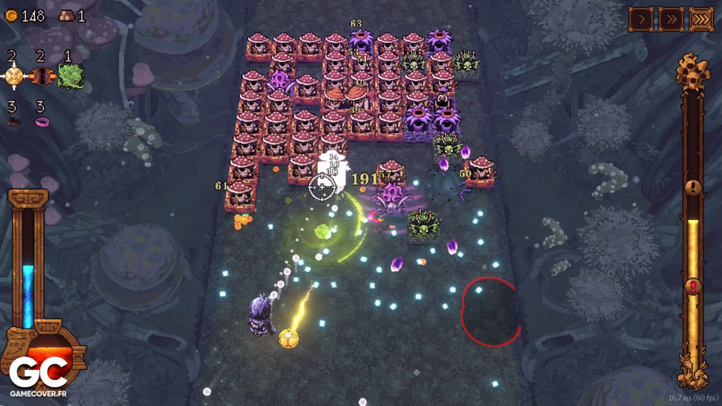 Chaque run vous permet de débloquer de nouvelles boules, et il y en a environ 50, ce qui permet une grande variété de combinaisons et de styles de jeu. Car oui, comme dans tout roguelite, il y a des builds à créer. Ici, c’est représenté par le choix des boules. On peut y trouver des boules de glace, de feu, de plante, de lumière et bien plus encore. Mais je vous laisse la surprise, car c’est un vrai plaisir de découvrir tout ça en jouant.