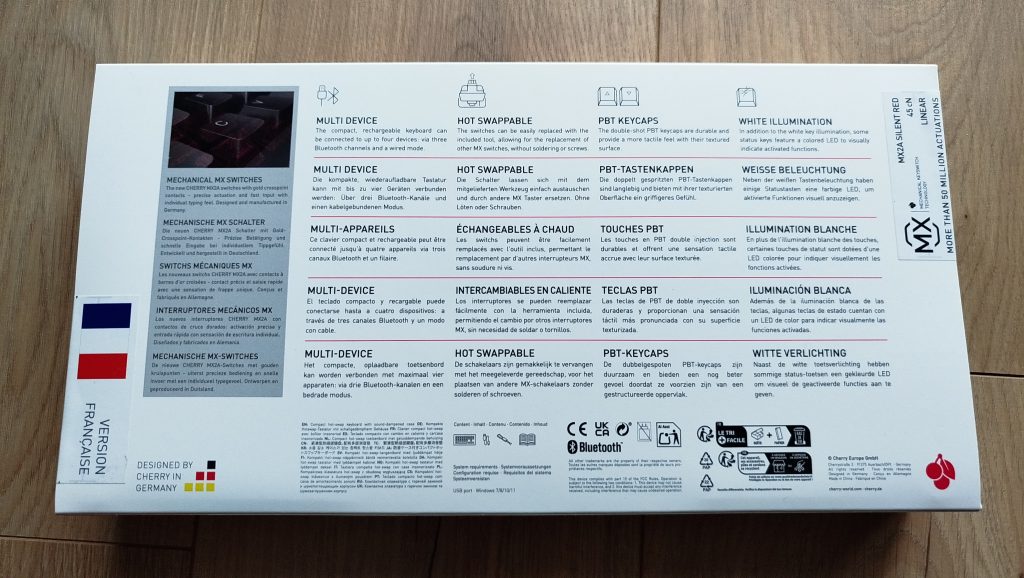 Le CHERRY KW 300W MX n’est pas qu’un joli clavier ; il sait aussi se faire ultra-polyvalent. En USB-C, il se recharge rapidement tout en restant utilisable. Du côté sans fil, il propose trois canaux Bluetooth, commutables via F1 à F3, plus un canal USB, pour basculer en un éclair entre votre PC, votre tablette et votre téléphone.
