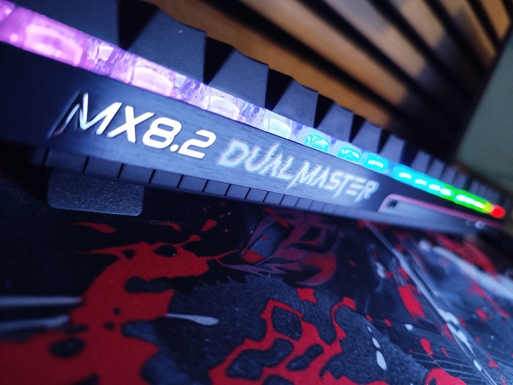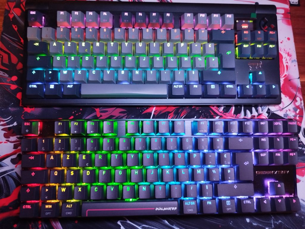 Face au MX 8.3 RGB, le MX 8.2 Dual Master on note tout de suite le côté plus compact en largeur du MX 8.2 mais il est aussi plus haut une fois ses petits pieds déployés. En termes de confort de frappe, on est sur un pied d’égalité. Le bruit des touches est plus étouffé sur le MX 8.3 et un chouya plus mécanique pour le 8.2 dans sa sonorité, sans avoir ce cliquetis qui casse la tête des voisins pour autant. Dans leurs fonctionnalités, le 8.3 a un côté plug and play plus immédiat grâce à son écran qui permet de jongler facilement entre les profils et fonctions du clavier. De l’autre côté, il faudra quelques combinaisons de touches mais rien de bien sorcier.