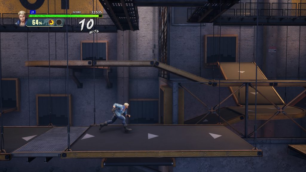 Et là vous allez me dire : c’est quoi un bon Double Dragon ? C’est vrai qu’avec tous les beat’em up sortis depuis, avec des retours réussis comme pour Streets of Rage ou TMNT, il va falloir envoyer du lourd et pas juste ressortir ce qui a déjà été fait avant. Déjà pour faire un bon Double Dragon, on se bagarre dans les rues, on monte à des échelles (donnant un verticalité pas commune pour l’époque) on se savate à coups de batte ou de barils, on tombe sur des gros balèzes, avec par moments des petites phases de plateformes nulles. Bonne nouvelle, on retrouve tout ça ! Même la plateforme nulle, pas de bol. Mais maintenant on veut aussi des évolutions ! Du combo, du juggle, de la technique et pas juste taper sur deux touches façon daron des 80’s.