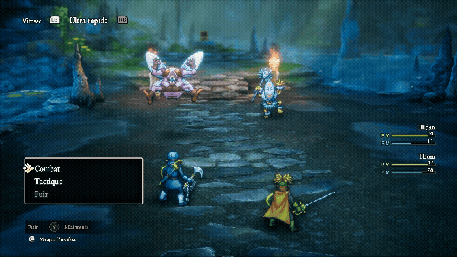 Au-delà des quêtes classiques de Dragon Quest, ce remake améliore le système. L’équipement est devenu plus important : face à des boss coriaces, j’ai dû régulièrement changer d’armes ou d’armures pour optimiser mes chances. Les personnalités de mes quatre personnages impliquent davantage de stratégies. J’avoue toutefois avoir principalement utilisé le système de tactiques automatiques, qui s’est révélé très utile : on peut configurer les compétences que chaque personnage peut utiliser sans intervention manuelle, ce qui évite de répéter les mêmes commandes dans chaque combat. C’est un confort appréciable pour les amateurs de farming d’XP.
