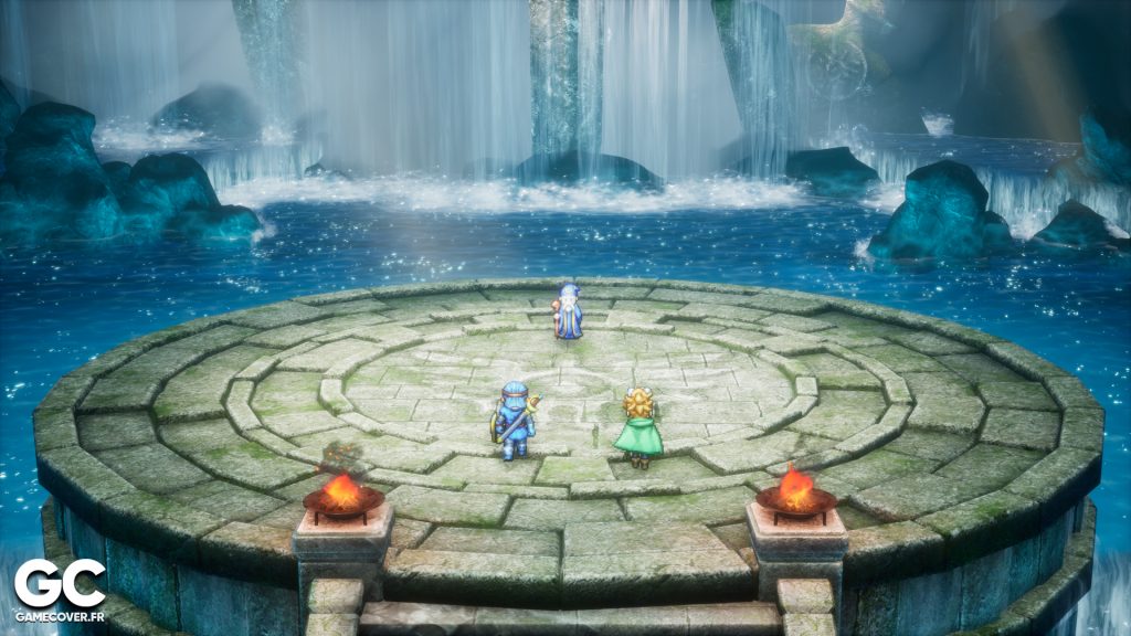 Alors que l’original était parfois décousu et chiant, ce remake du 2 nous offre une histoire bien écrite de A à Z, avec des personnages enfin définis et une intrigue assez touchante.. On y retrouve le postulat classique : des descendants d’Elric sont à la tête des Trois Grands Royaumes, mais la trêve est rompue. Médiévande, Cannock et Ruisselune – « fondés par les descendants du héros Elric » – prospèrent depuis des années. Le sentiment de fatalité est bien réel : le mal se réveille et les royaumes sont en danger. Des années après l’attaque de Lordragon sur le monde, Kaos prend le relais et veut déverser les ténèbres sur la terre.. La force du remake tient également au fait qu’il conserve l’esprit de l’original, avec la quête des sceaux, des sanctuaires et des artefacts légendaires, tout en ajoutant de nombreux détails et personnages que l’on apprend à connaître à chaque nouveau chapitre de l’histoire.. Par exemple, on explore un nouveau territoire comme Landelune et d’autres cités inédites comme Mervillia où l’on s’attarde volontiers.