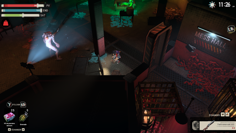 L’arsenal est d’ailleurs assez varié : batte, pistolet, fusil à pompe, grenades mais des hitbox parfois capricieuses et des animations qui perturbent la détection des tirs obligent à temporiser entre deux salves pour ne pas gaspiller de balles. On trouve même un taser qui permet d’activer certaines installations électriques, qui permettront d’activer des mécanismes notamment, sympa. On vise avec le stick droit, on tire avec RT, classique ! On aurait par contre apprécié un peu plus de variété dans le bestiaire, limité à des arachnides, des humains parasités ou des tentacules façon hentai, on a au final une dizaine de bestioles avec des patterns pas bien difficiles… Dans le tas, seul un boss est un peu lourdingue mais on peut en venir à bout à cause d’un bug de collision, magnifique !