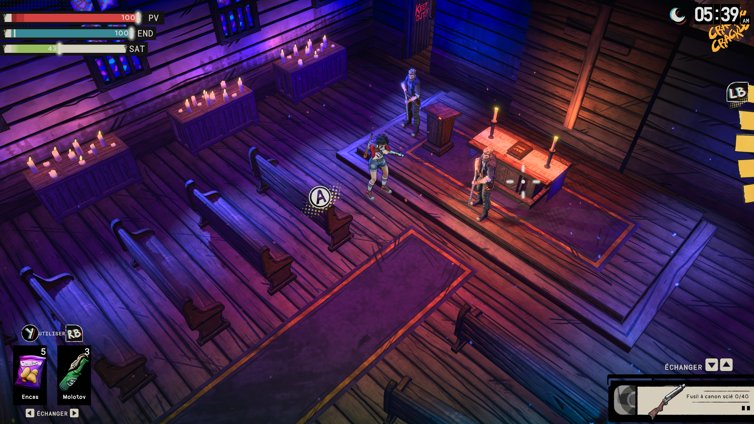L’atmosphère est la vraie réussite du titre : une esthétique comics aux couleurs vives mais assombries, un cycle jour/nuit qui module les missions, et une bande-son qui joue son rôle d’élément de tension. Le doublage anglais fait le job, les textes sont traduits en français, et malgré quelques couacs narratifs, on reste accroché aux mystères du culte et aux petites révélations disséminées dans l’environnement.