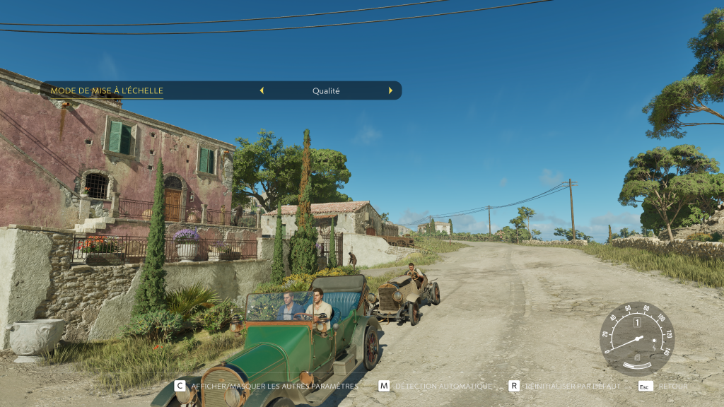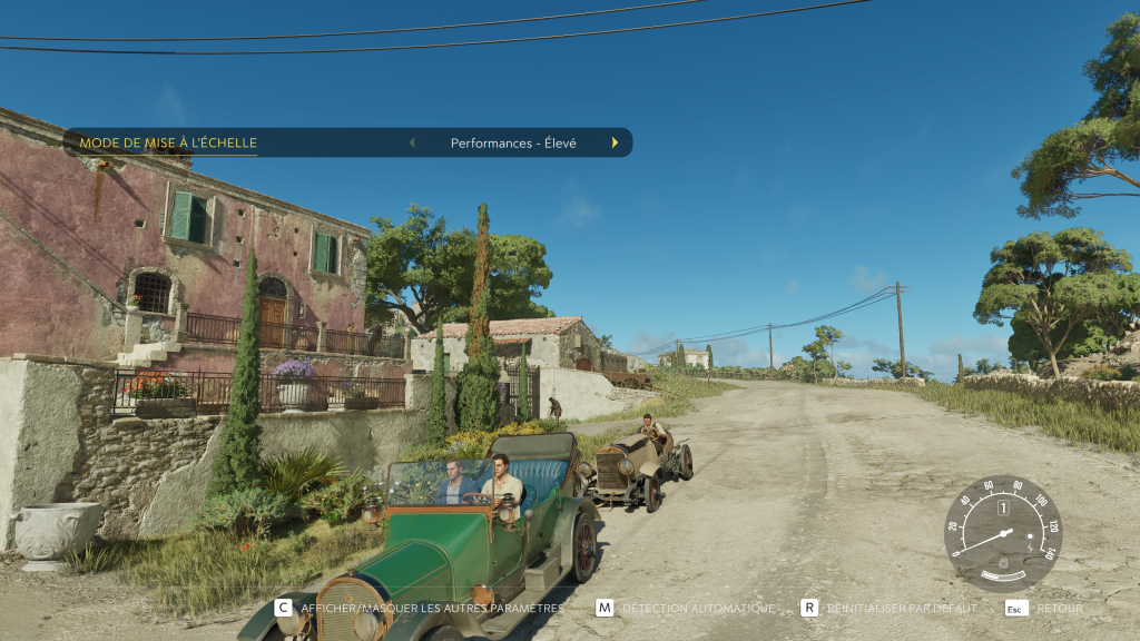 Abordons le sujet qui fâche un peu : la technique sur PC. Je vais être direct : Mafia: The Old Country n’est pas un modèle d’optimisation à sa sortie. Ma configuration de test (RTX 3090, Ryzen 9 3900XT, 32 Go de RAM) aurait dû faire tourner le jeu comme un charme en 4K… Eh bien, pas tout à fait. Avec les réglages en Ultra et le DLSS en mode Performance (pour réduire la résolution interne), j’ai oscillé en moyenne autour de 40-55 FPS dans la plupart des scènes. Ce n’est déjà pas fou pour une config de ce calibre, mais le pire ce sont les chutes brutales que j’ai subies sur certaines séquences. L’introduction par exemple, avec ses effets explosifs et son nombre d’éléments à l’écran, a vu mon framerate plonger à 20 FPS par moments ! 😱 Autant vous dire que sur le coup, j’ai cru que mon PC allait mourir… Ces gros ralentissements restent heureusement rares (essentiellement dans 2-3 scènes très chargées en particules/NPC), le reste du temps le jeu tourne entre 45 et 60 FPS. Mais ne vous attendez pas à du 60 FPS constant en 4K sans concessions, loin de là. Il faudra soit baisser quelques options graphiques, soit accepter quelques saccades ponctuelles. D’ailleurs, en extérieur, j’ai remarqué aussi quelques micro-stutters par moments lors des déplacements en voiture ou à cheval, probablement dus au chargement du monde. Rien de catastrophique, mais c’est là.