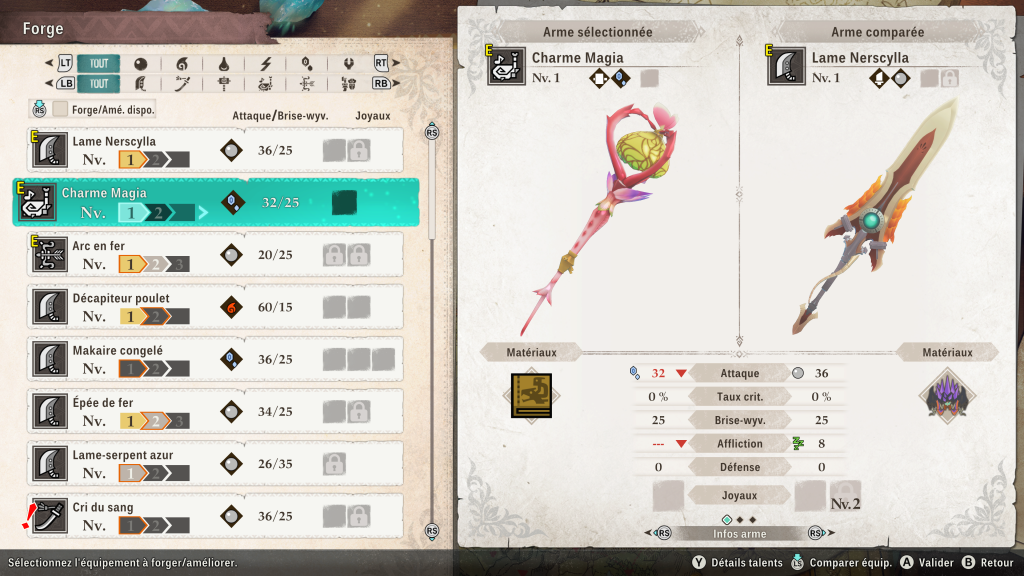 Impossible de ne pas évoquer également l’équipement ou le craft, éléments importants de la saga, qui trouvent ici également leur place. En récoltant des objets dans vos explorations, après des combats ou en échange, vous pourrez fabriquer armes ou armures, à équiper selon les circonstances car ce n’est pas que l’aspect protection qui prévaut mais aussi les différentes stats apportées par l’équipement (attaque, taux de critique, défense…)