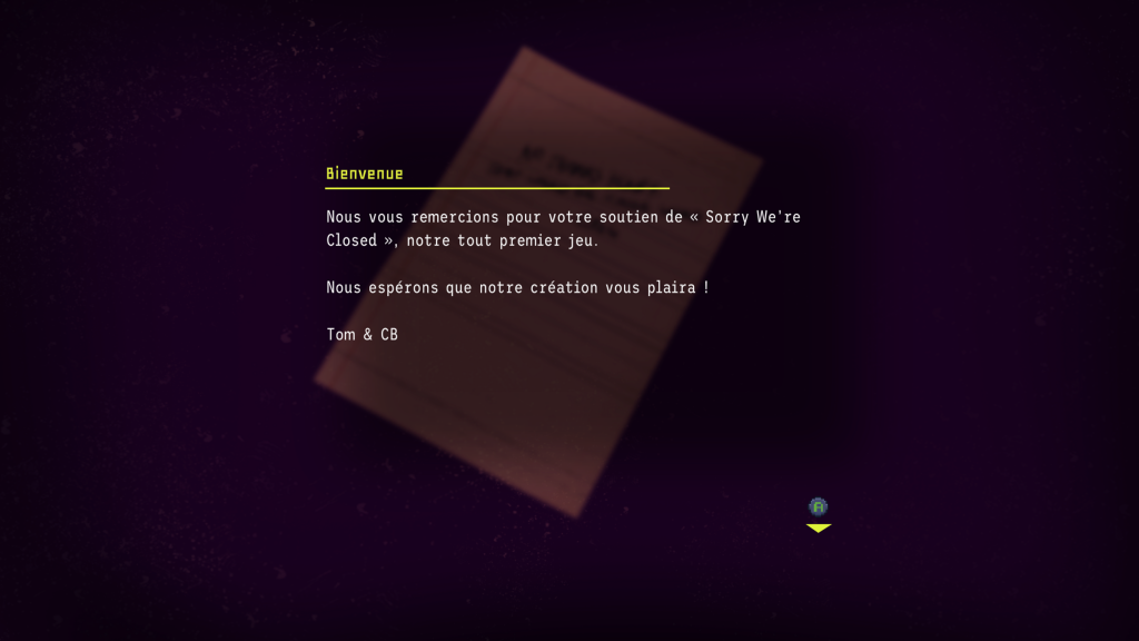 Sorry We’re Closed est un premier titre prometteur pour le studio. On ne peut que saluer les nombreuses qualités du titre. Ainsi que le vibrant hommage aux classiques du genre. Un titre à découvrir rapidement et à promouvoir afin de soutenir une petite équipe de passionnés qui pourrait nous réserver d’autres surprises…