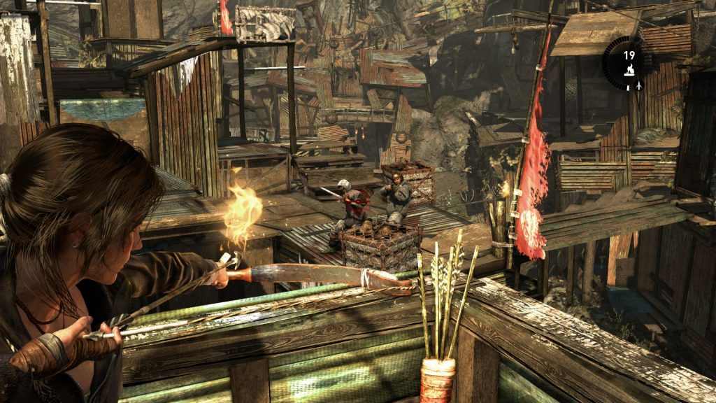 Le Reboot de Tomb Raider de 2013 a introduit différents gadgets et améliorations de son arsenal pour fluidifier le gameplay de Lara, ce qui met l’accent sur le côté survie et modernisation pour un confort de jeu sans appel. Pour ce faire, l’arc est l’arme par excellence pour ce titre qui nous permet de faire beaucoup de choses, comme dans un premier temps abattre nos ennemis qu’il soit a distance ou un peu plus éloigné de façon furtive, il peut également nous servir a nous déplacer d’une paroi a une autre qui pourrai nous être impossible à atteindre, cela grâce a l’amélioration qui nous donne droit aux flèches grappin permettant de faire des tyroliennes.