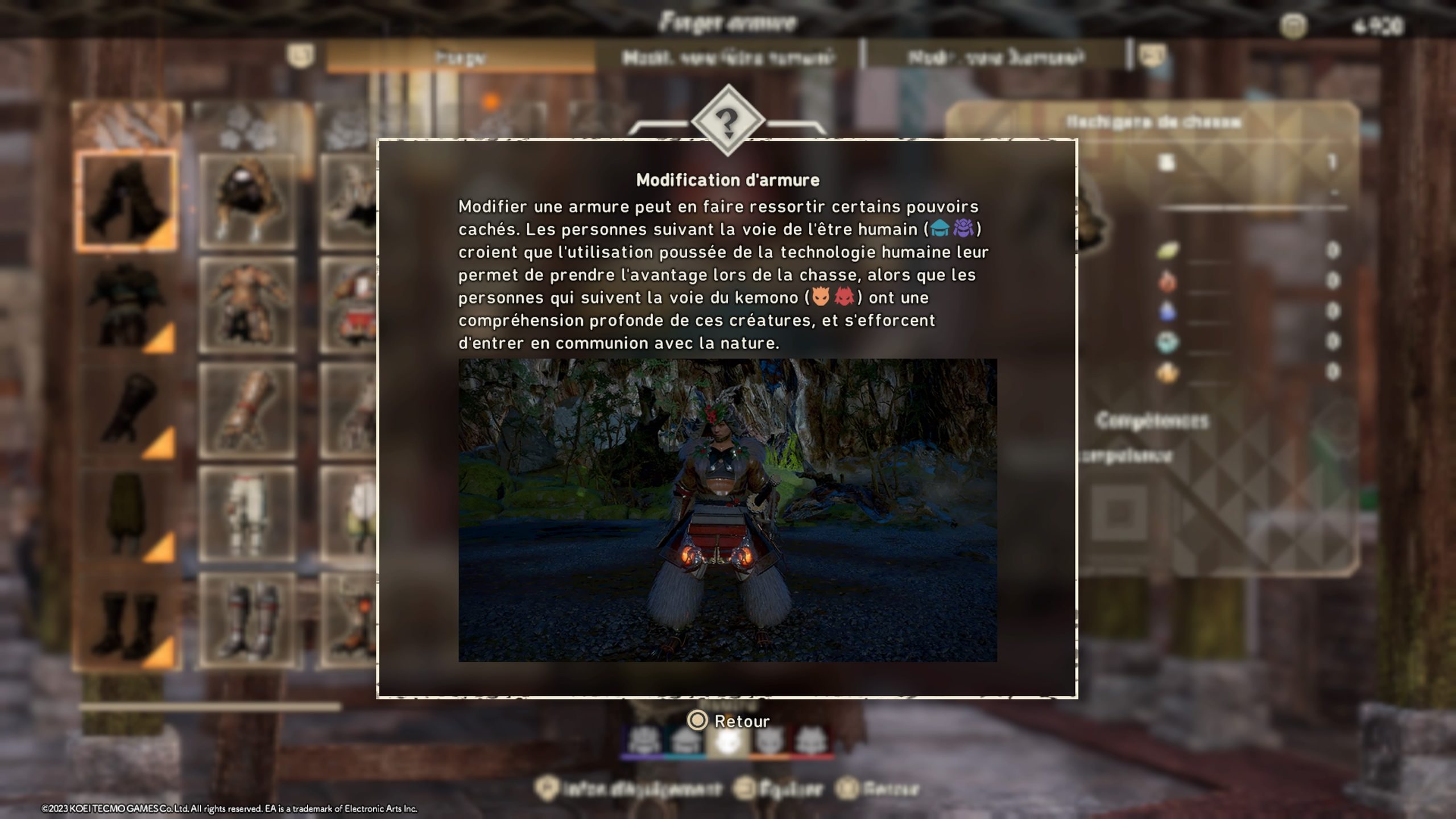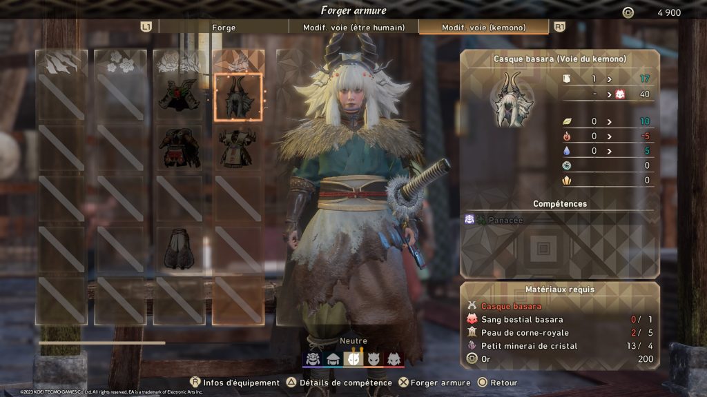 On ne fera pas durer le suspense trop longtemps, OUI, Wild Hearts mérite toute votre attention ! La première raison est sans aucun doute la période choisie et son environnement ! En effet pour peu que vous soyez fan des univers médiéval japonnais, Wild hearts réponde d’emblée à cette demande. Dans la lignée d’un Ghost of Tsushima dans sa construction : katana, chapeau de paille, ambiance de film de sabre japonnais et petite bourgade perdue au milieu des rizières tout est fait pour que vous vous sentiez chez vous. Comme toujours le jeu commence par la création de votre avatar et là encore le jeu n’a pas a rougir des possibilités offertes par la concurrence. L’outil est même très complet et vous permettra de créer votre alter ego qui pourra ensuite s’équiper de différents types d’armes afin de mener à bien ses missions. Ces dernières se comptent au nombre de huit : lame-griffe ( double lames ), katana karakuri ( épée longue ), arc, wagasa à lame ( sorte de parapluie ), canon ( très apprécié à distance ), nodachi ( grande épée imposante ), Marteau et bâton karakuri. Là ou Wild Hearts dénote de sa concurrence c’est qu’en plus d’afficher une ambiance médievale, celle ci se mélange également à une autre fortement appréciée : le steampunk ; pour le coté mécanique des armes mais également des outils que vous pourrez tout au long de votre périple utiliser appelés karakuri. Ces derniers disposent de trois formes de développement qui sont basique, fusionné et draconique et qui selon l’évolution apporteront un confort de chasse supplémentaire. Vous pourrez en avançant dans le mode histoire débloquer une multitude de gadgets qui seront répertoriés de la façon suivante :