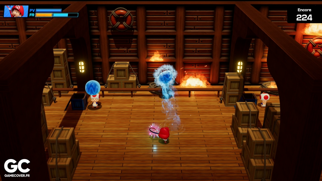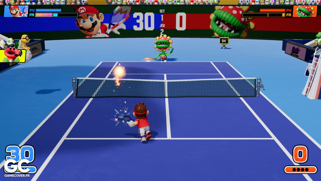 À cela s’ajoutent une trentaine de raquettes frénétiques, chacune modifiant la manière de jouer. Feu, glace, foudre, banane, volcan, fantôme, mini champi… Les effets sont variés et influencent directement le rythme des échanges. Les combinaisons personnage et raquette deviennent nombreuses, et c’est là que le jeu gagne en profondeur.