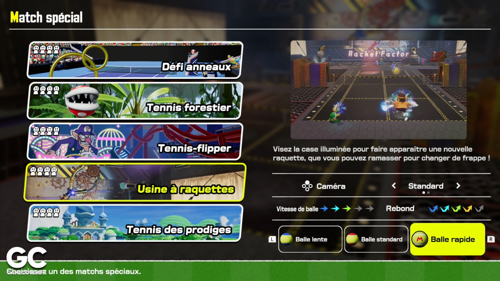On peut lancer un match en simple ou en double, avec ou sans raquettes frénétiques, ajuster les règles, tester différentes combinaisons de personnages et de raquettes, et jouer jusqu’à quatre joueurs.