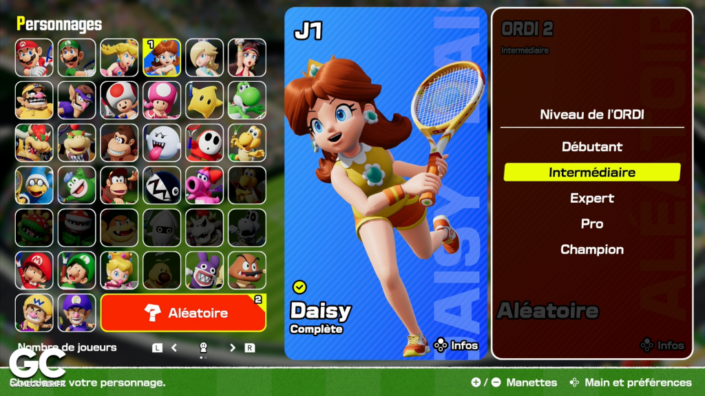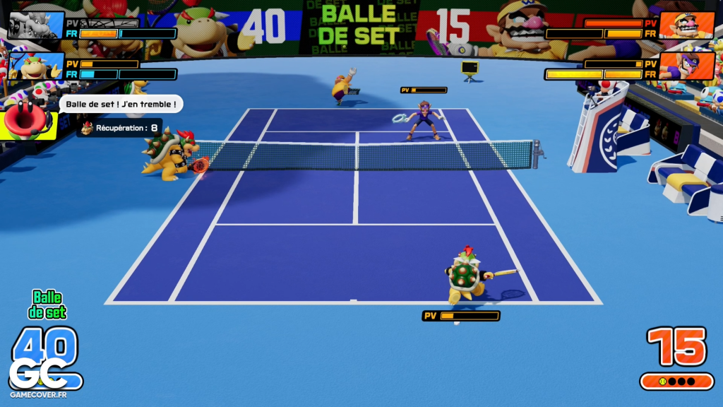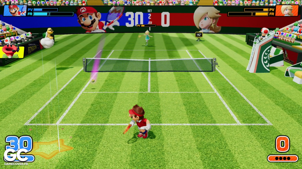 Les matchs sont commentés par la Fleur Prodige, directement issue de Super Mario Bros. Wonder. Sa présence apporte une petite touche de personnalité supplémentaire aux rencontres. Elle réagit aux échanges, ponctue les points importants, et contribue à donner une vraie identité aux matchs. Bonne nouvelle : si elle devient trop présente à ton goût, il est possible de la désactiver.