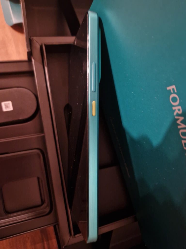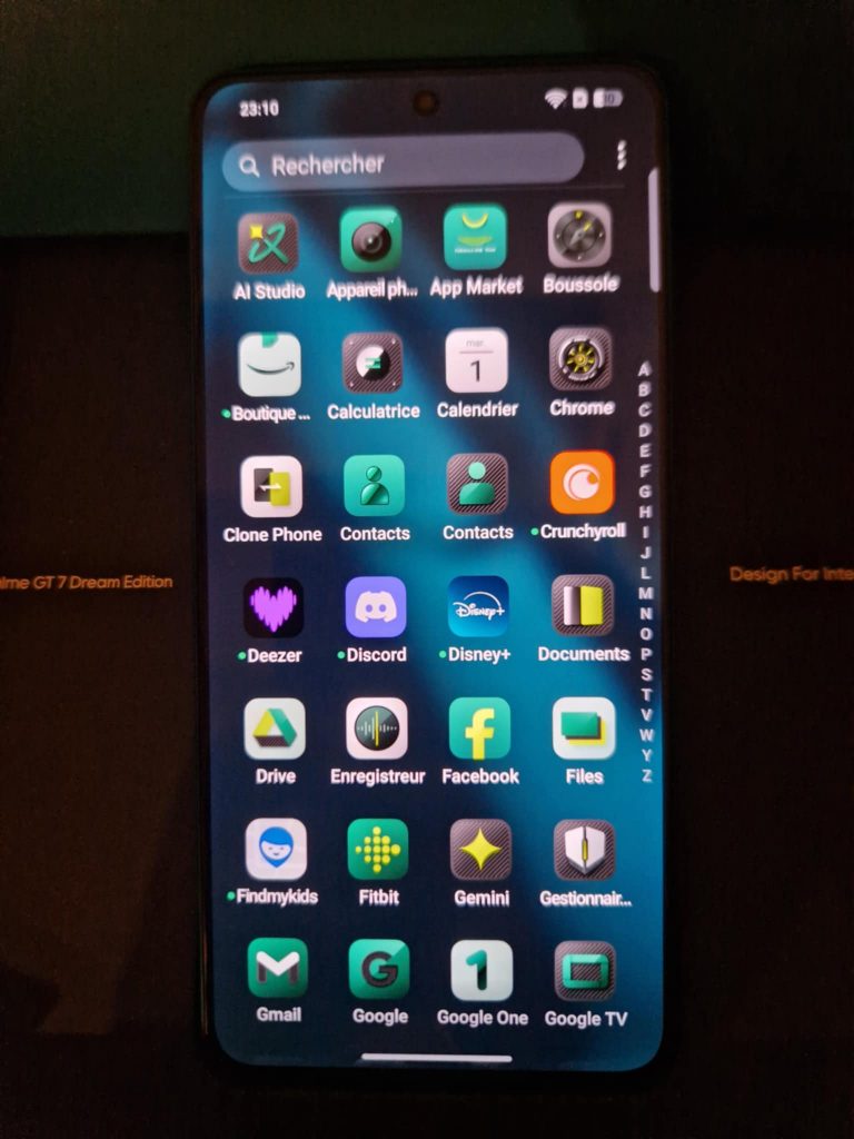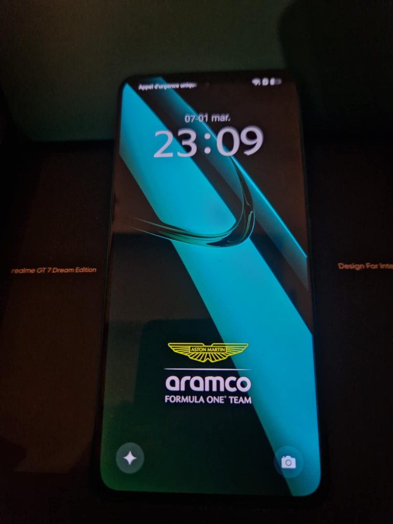 Petit détail amusant le bouton d’allumage est jaune, en allumant le realme me GT7, nous pouvons apercevoir que même le thème est entièrement pensé aux couleurs de la marque. Et petit détail amusant, je vous parlait des codes couleurs plus en amont de mon unboxing et sur l’écran de chargement nous retrouvons ce vert plus foncé ( HEX00352F) mais également le logo au dessus de la marque aramco qui eux aussi arborent les codes couleurs CEDC00 (jaune) et FFFFFF ( pour le blanc) ; la boucle est bouclée!